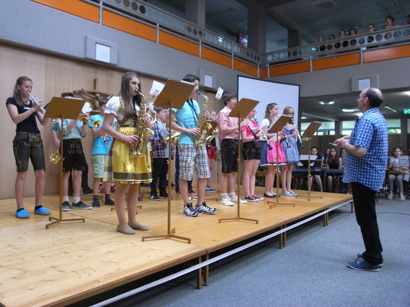 Eine Blasmusikband der vierten Klassen unter der Leitung von Peter Pedarnig sorgte sofort für beste Stimmung. Ein Tanz, an dem Schüler und Schülerinnen Lehrer und Lehreinnen und sogar unseren Direktor auf die Bühne führten, hielt die Stimmung hoch.