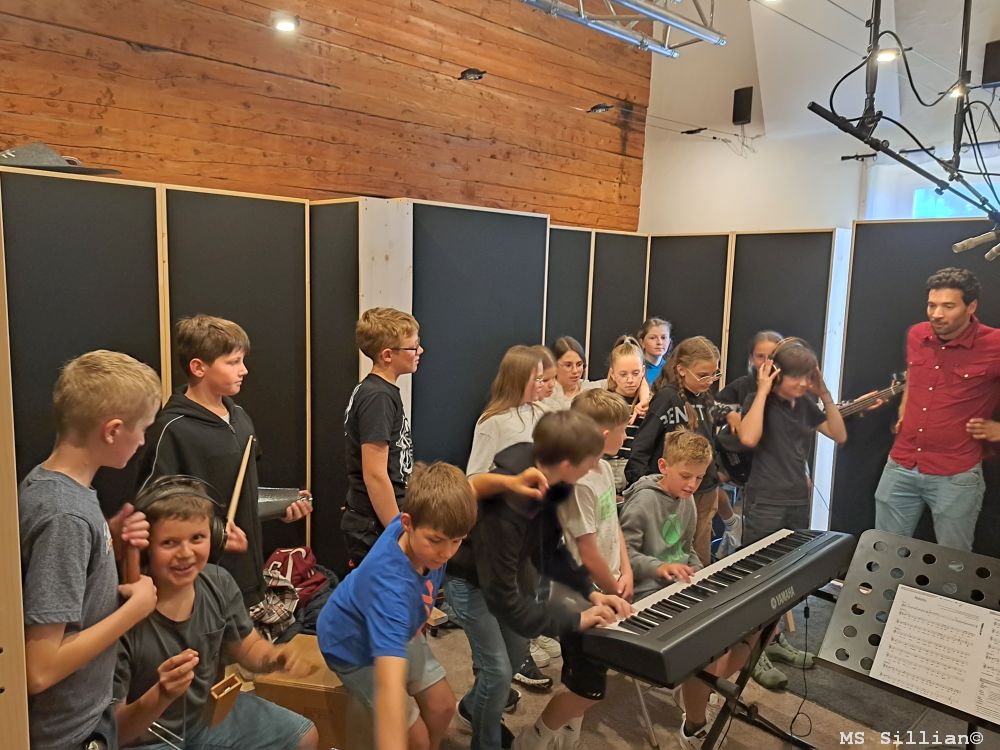 Nach der Besichtigung bauten wir unsere Instrumente auf und bereiteten uns auf die Aufnahme unserer Lieder vor. Wir nahmen zwei Stücke auf: "Makeba" und "In die Berg bin i gern". Unter der Anleitung von Thomas verlief die Aufnahme reibungslos, und wir hatten viel Spaß dabei, unsere eigenen Lieder im professionellen Umfeld eines Tonstudios aufzuführen.