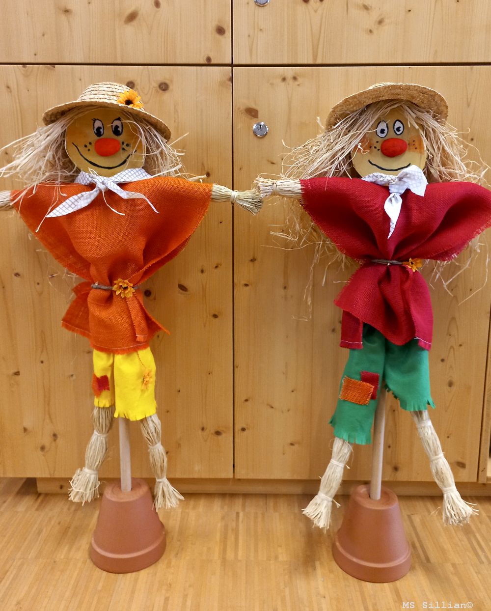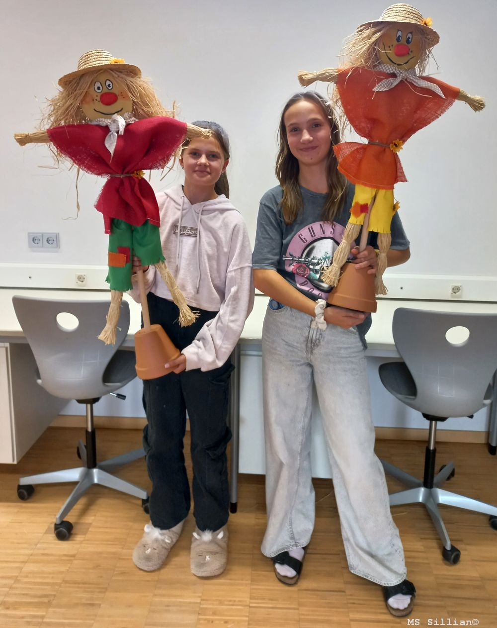Im heurigen Schuljahr hat sich die 4m-Klasse mit vollem Eifer auf den kreativen Weg gemacht, aus Holzstöcken und verschiedensten Materialien kunstwerkhafte Vogelscheuchen zu kreieren. Eine gute Portion Geschicklichkeit, die diese Arbeit erfordert, und der richtige Umgang mit diesen Werkstoffen lassen nun die Vogelscheuchen in leuchtenden Farben erstrahlen.