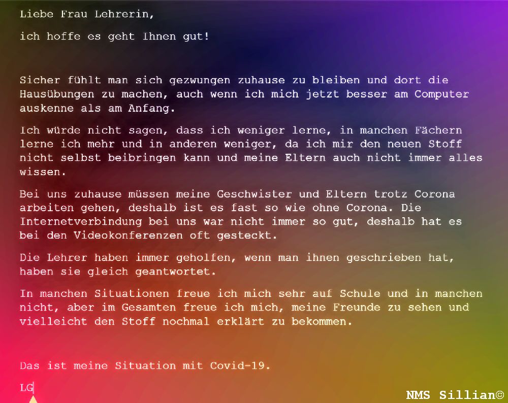 Die Schülerinnen und Schüler der dritten Klassen nahmen die Meinungsäußerung "Gefangen und ausgeliefert: Das Homeschooling und ich" von Frau Anja Kofler in der Onlinezeitung "Dolomitenstadt" zum Anlass, über ihre Erfahrungen der letzten zwei Monate in Form eines Briefes an ihre Lehrerin zu berichten.