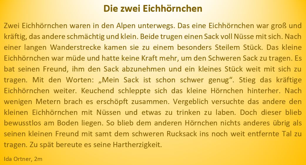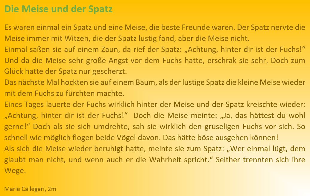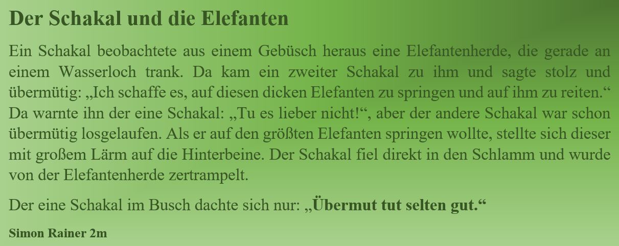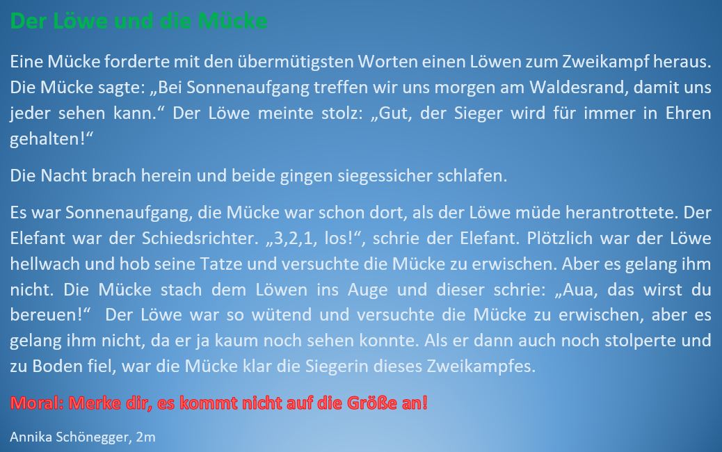 In einem weiteren Schritt haben wir die Zeit des Lockdowns dazu genützt, uns beim Schreiben von eigenen Fabeln auszuprobieren oder Fabeln umzuschreiben. Einige Ergebnisse könnt ihr hier lesen. Viel Spaß dabei wünschen euch die 2m-Klasse!