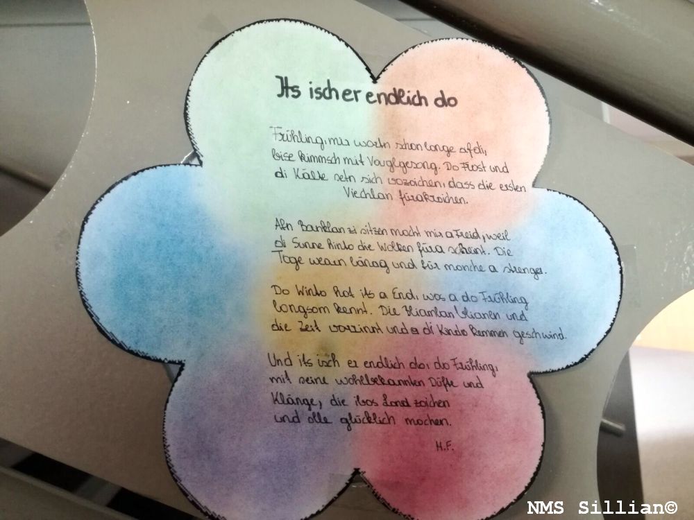 Im Rahmen des Deutschunterrichtes verfassten die 4. Klassen zum Thema Frühling ihr eigenes, ganz persönliches Gedicht. Eine Wörtersammlung zum Thema war die Basis für das Schreiben der lyrischen Texte. So entstanden kunstvolle Mundartgedichte, Gedichte über die Landwirtschaft und Gedichte, bei denen man die Freude über den Frühling spüren kann.