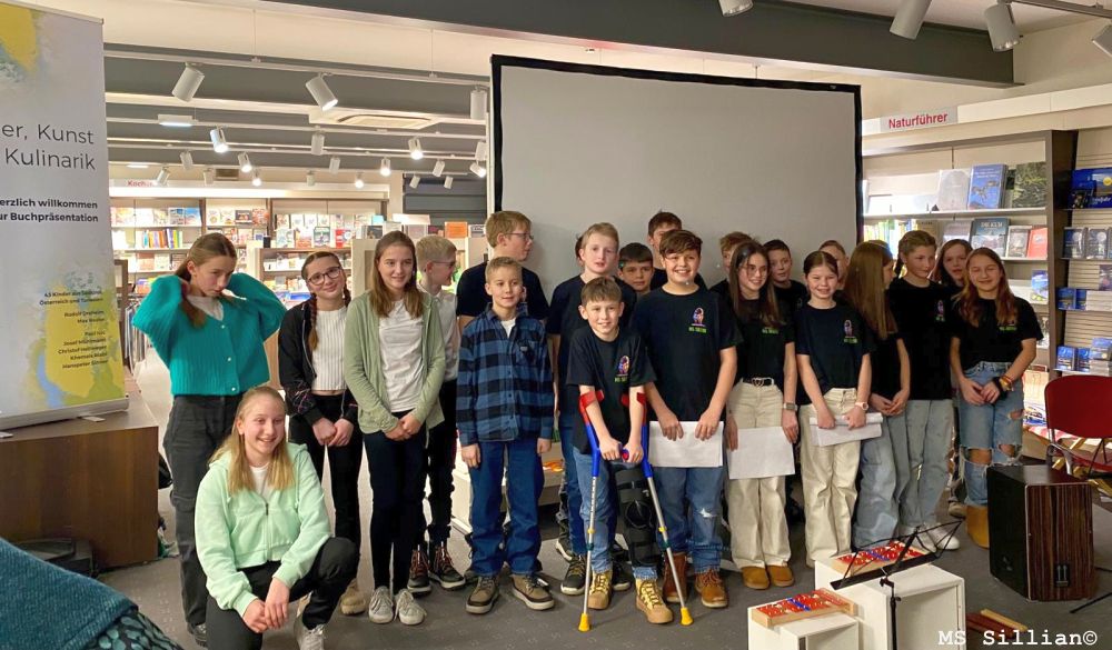 In der Tyrolia in Lienz lasen 6 Schüler/-innen ihre Texte und die von Kollegen/-innen vor. Die 2m mit ihrer Lehrerin Karin Schneider interpretierte sehr gekonnt 3 Lieder von Max Raabe und für die Kulinarik sorgte die 3m mit ihrer Lehrerin Sabrina Fuchs mit feinen Sternenbrötchen.