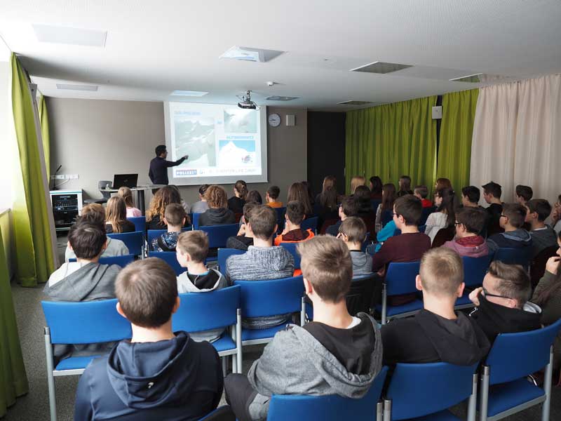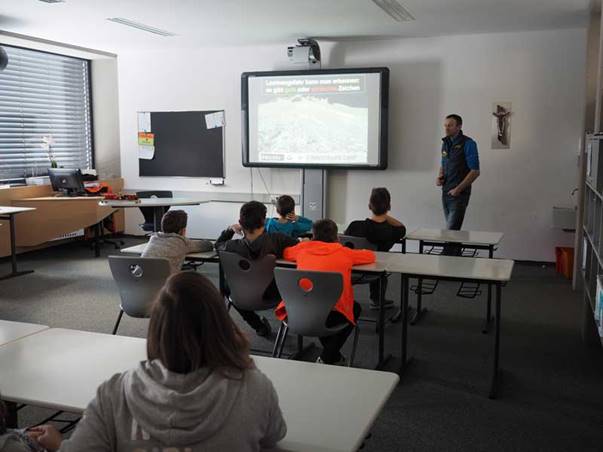 Günther Gasser von der Alpinpolizei unterrichtete die SchülerInnen wie man schon im Vorfeld Informationen einholen kann, wie Hilfe über Notrufnummern geholt wird, wie die Einsatzkräfte mobilisiert werden können und vor allem, wie wichtig es ist, Beobachtungen genau zu melden.