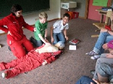 Nach einer einstündigen theoretischen Einführung durften sie zwei Stunden lang an einer Puppe Herzmassage, Beatmung oder den Einsatz eines Defibrillators üben. Mit dieser Übungseinheit wird der Mut der Jugendlichen, in Extremsituationen Erste-Hilfe zu leisten, gestärkt.