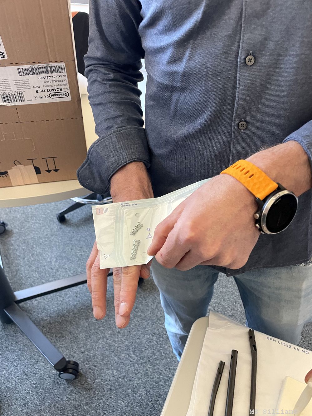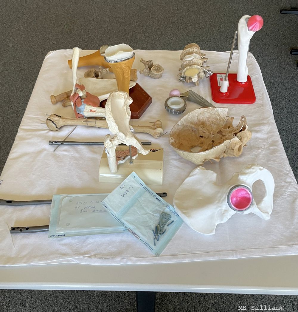 Um den Schülern einen noch greifbareren Eindruck zu vermitteln, hatte Dr. Schneider Anschauungsmaterial mitgebracht. Knochen, Platten und Schrauben verdeutlichten den Schülerinnen und Schülern die technischen Aspekte der Unfallchirurgie. Zusätzlich zeigte er künstliche Gelenke und erläuterte, wie diese im Rahmen von Operationen eingesetzt werden.