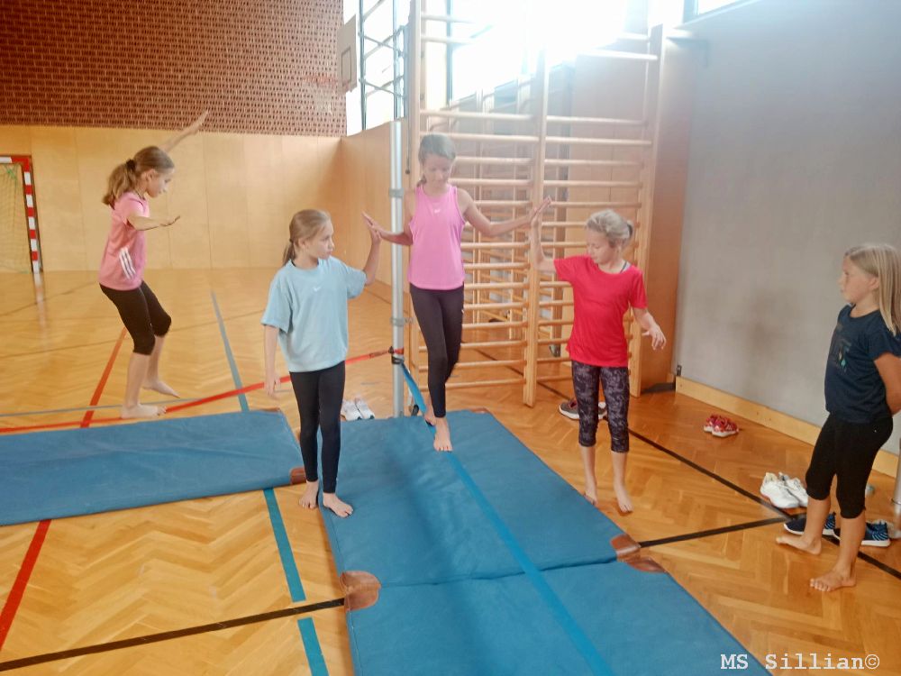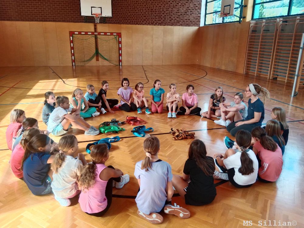 Unter der Anleitung von Profi-Slacklinerin Katharina Ortner aus Sillian konnten die SchülerInnen erste Erfahrungen in dieser Sportart erleben. Beim Slacklinen balanciert man auf einem Band, das zwischen zwei Fixpunkten (meistens Bäume) gespannt ist.