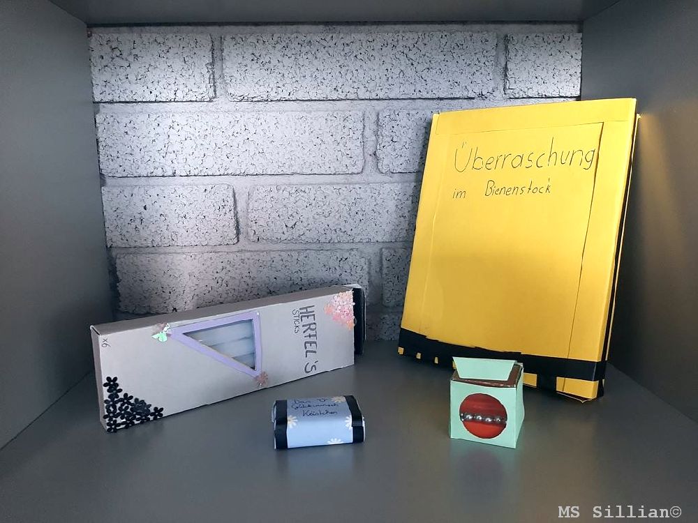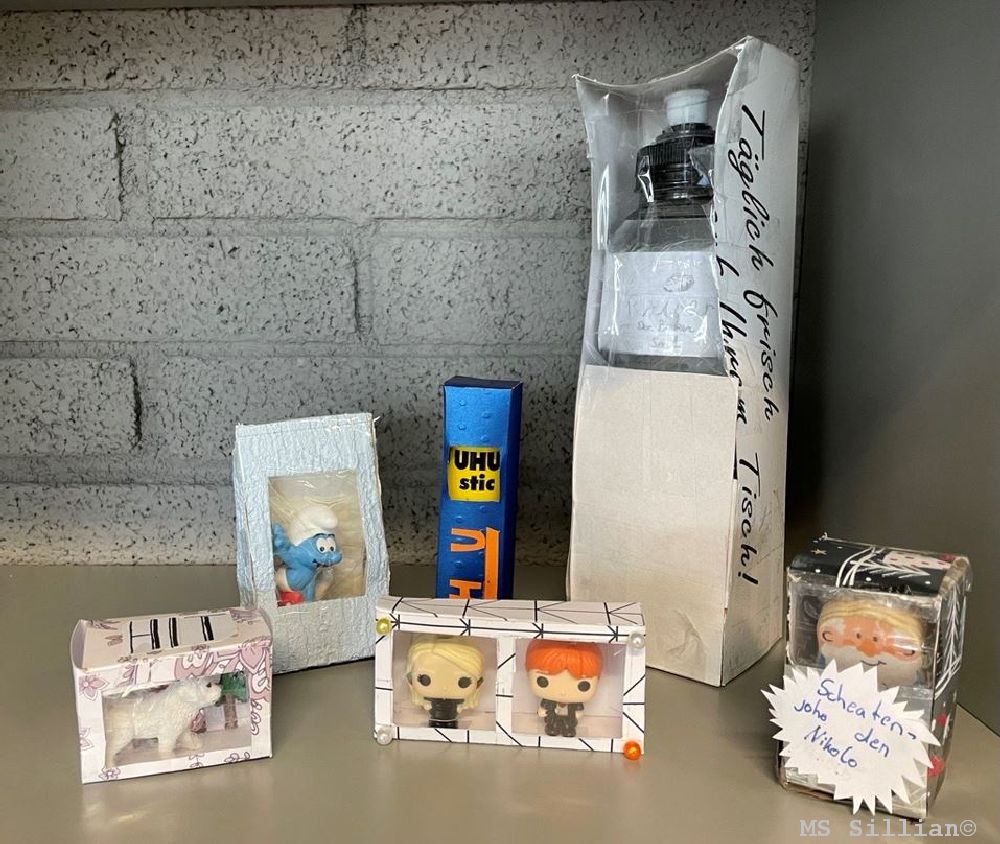 Zuerst haben wir uns einen Gegenstand ausgesucht, den wir verpacken konnten. Die Verpackung sollte platzsparend sein und es sollte möglichst wenig Abfall produziert werden.