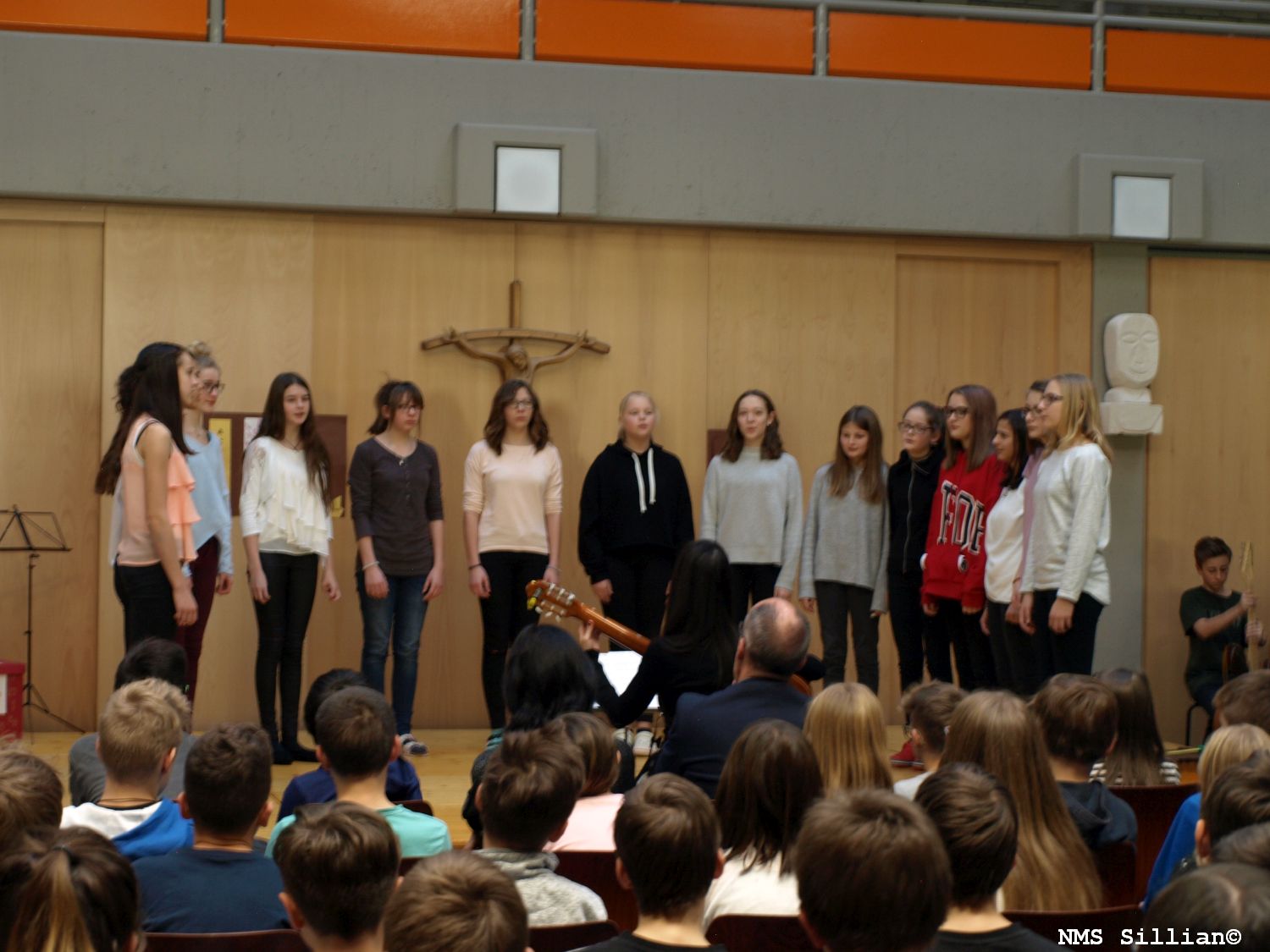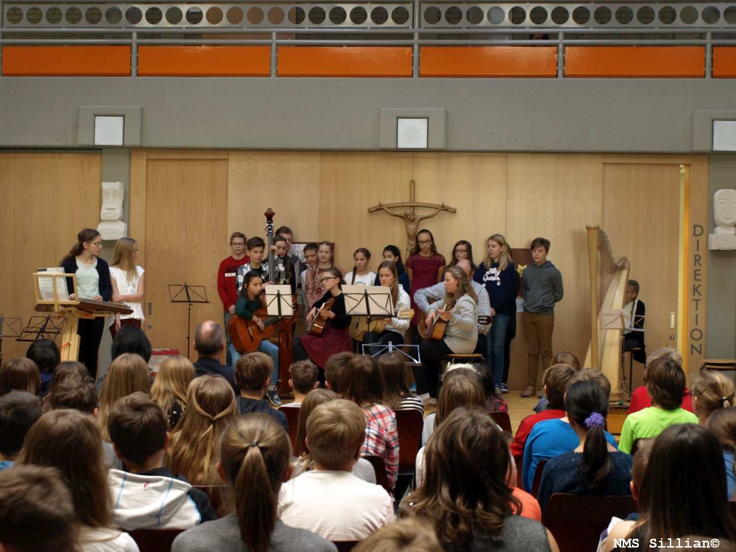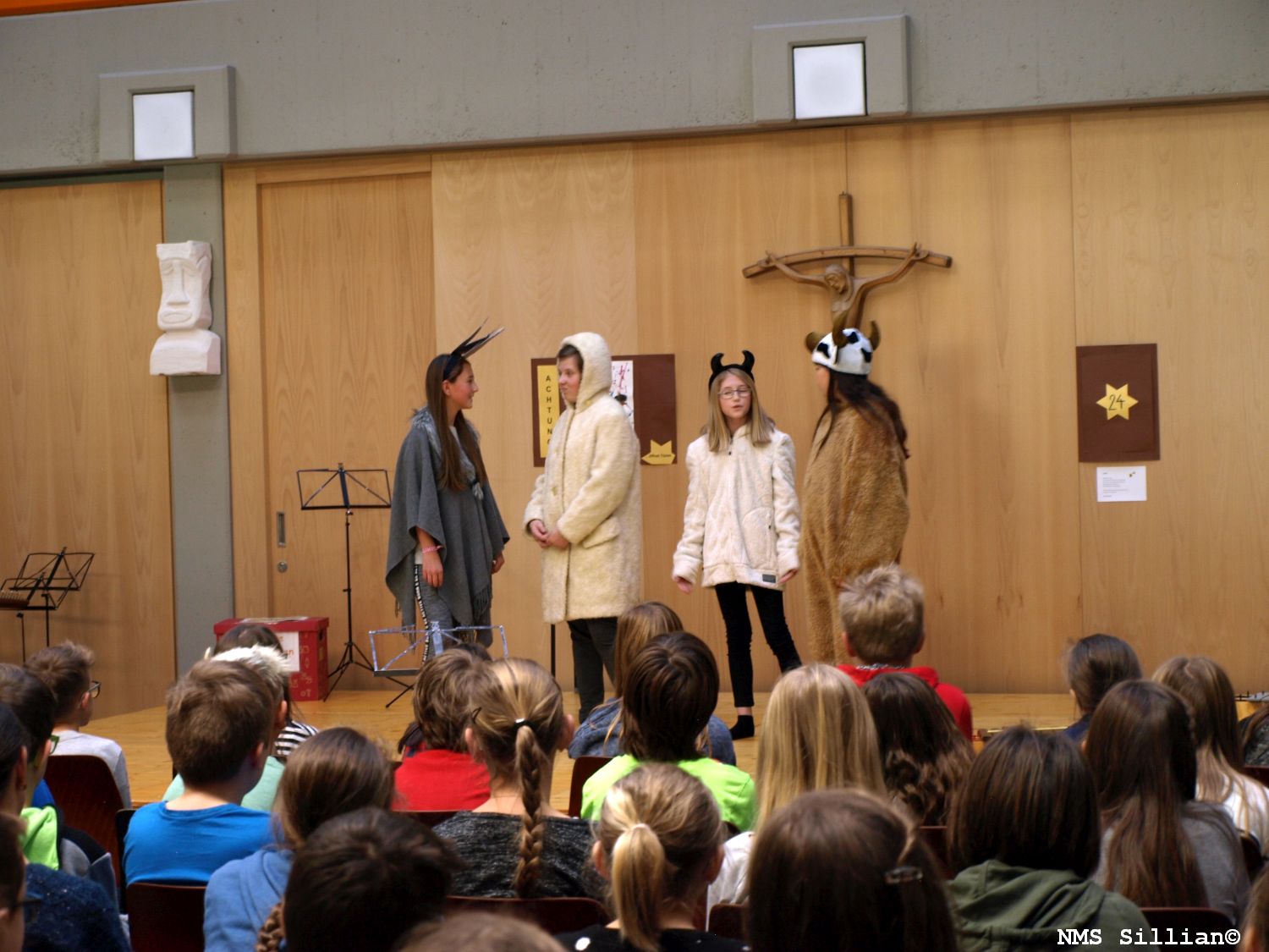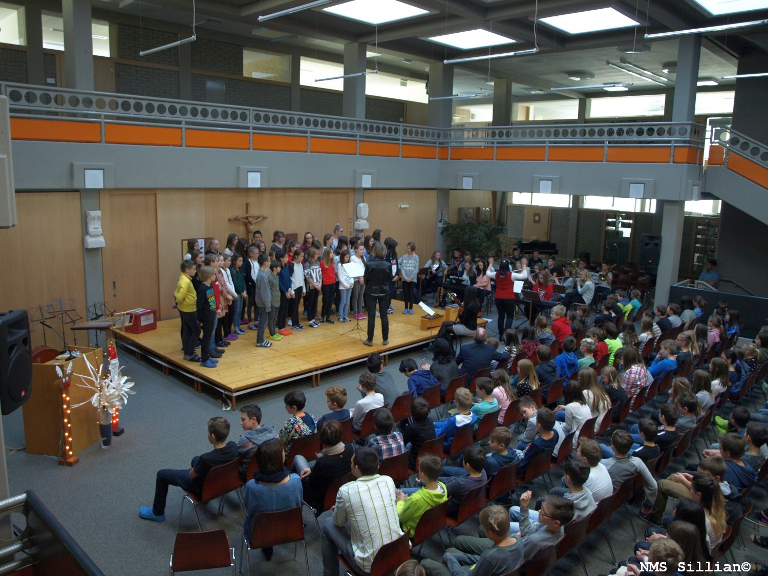 Ein Blechbläserensemble unter der Leitung von Fr. Fuchs Alexandra stimmte mit weihnachtlichen Weisen auf die Feier ein. Die einzelnen Klassenchöre aller Musikschwerpunktklassen unter der Leitung der jeweiligen MusiklehrerInnen brachten anschließend gesangliche („Eine kleine Kerze“, „Mitten in der Weihnacht“, „Guten Abend“, „A world of peace and harmony“,…) und instrumentale Beiträge dar. Die „Weihnachtsgeschichte vom Lametta“ zauberte so einigen ZuhörerInnen ein Lächeln ins Gesicht und instrumentale Beiträge gespielt vom Gitarrenensemble der 4m und einer Stubenmusik der 3m, sowie einem Klarinettenstück und einem Beitrag auf der Harfe zeigten die musikalische Vielfalt unserer Schwerpunktklassen auf. Ein besonderes Highlight war sicherlich das weihnachtliche Theaterstück, vorgetragen von Schülerinnen der Klasse 2b, welches von Fr Bucher Maria einstudiert wurde. Nicht fehlen durfte auch das Schulorchester unter der Leitung von Fr. Fuchs Alexandra und Hr. Pedarnig Peter, welches die beiden Stücke „White Christmas“ und „The First Nowel“ zum Besten gab. Der Schulchor unter der Leitung von Fr. D’Orlando Claudia und Fr. Mair Simone rundete das stimmungsvolle Konzertprogramm mit den Liedern „Er kommt bei uns an“ und „Wieder naht der heil’ge Stern“ ab.