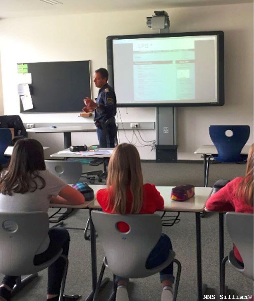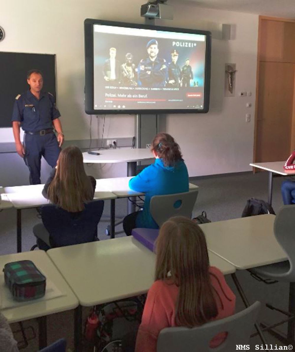 Im BO - Unterricht besuchte Postenkommandant Jakob Ebner die 3. Klassen und erklärte den Schülern und Schülerinnen wie man Polizist/Polizistin werden kann. Neben dem Ablauf der Ausbildung erklärte er auch, welche verschiedenen Möglichkeiten man bei der Polizei hat. Vom Streifenpolizisten über den Cobra Beamten bis hin zum Hundeführer brachte er den Schülern und Schülerinnen den Beruf des Polizisten/der Polizistin näher. Auch über den Tagesablauf eines Polizisten/einer Polizistin und über die verschiedenen Facetten des Berufs berichtete der Postenkommandant.