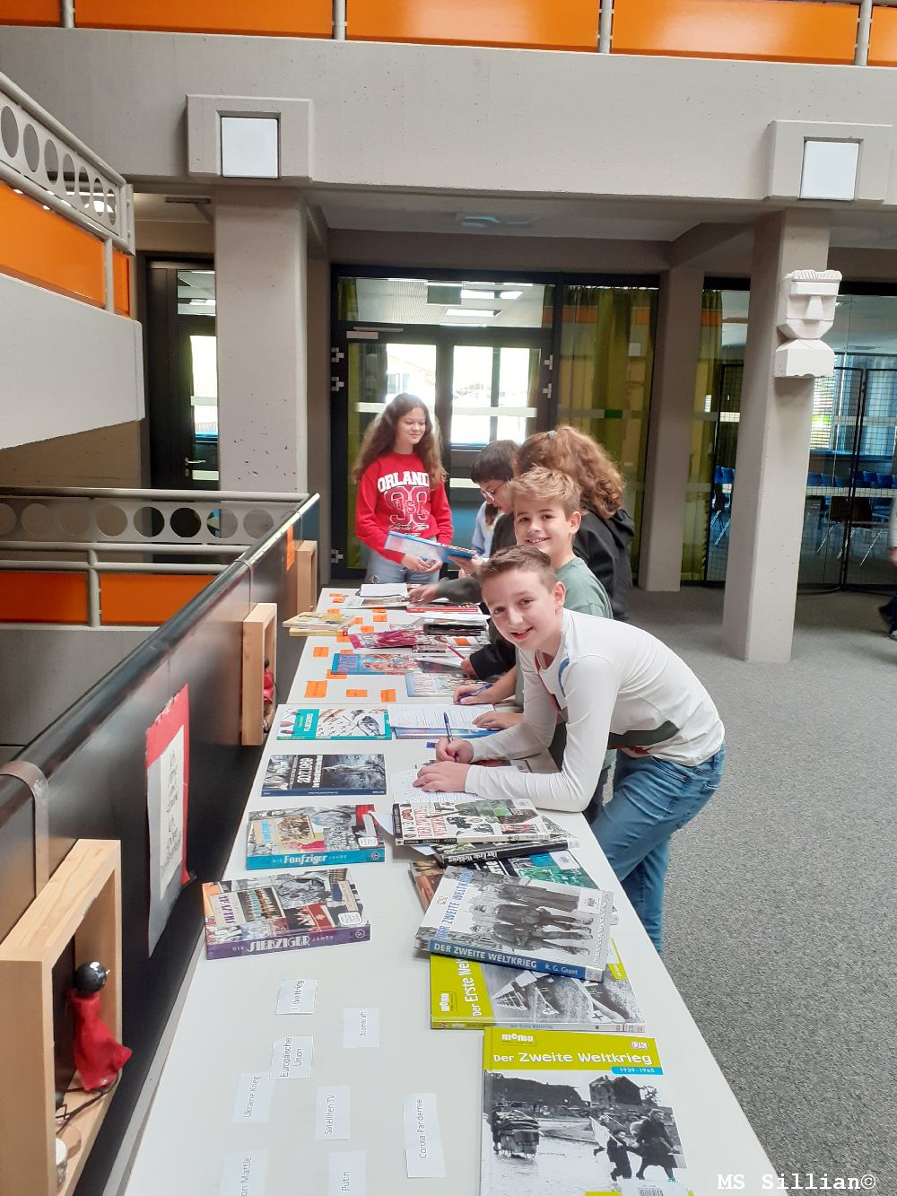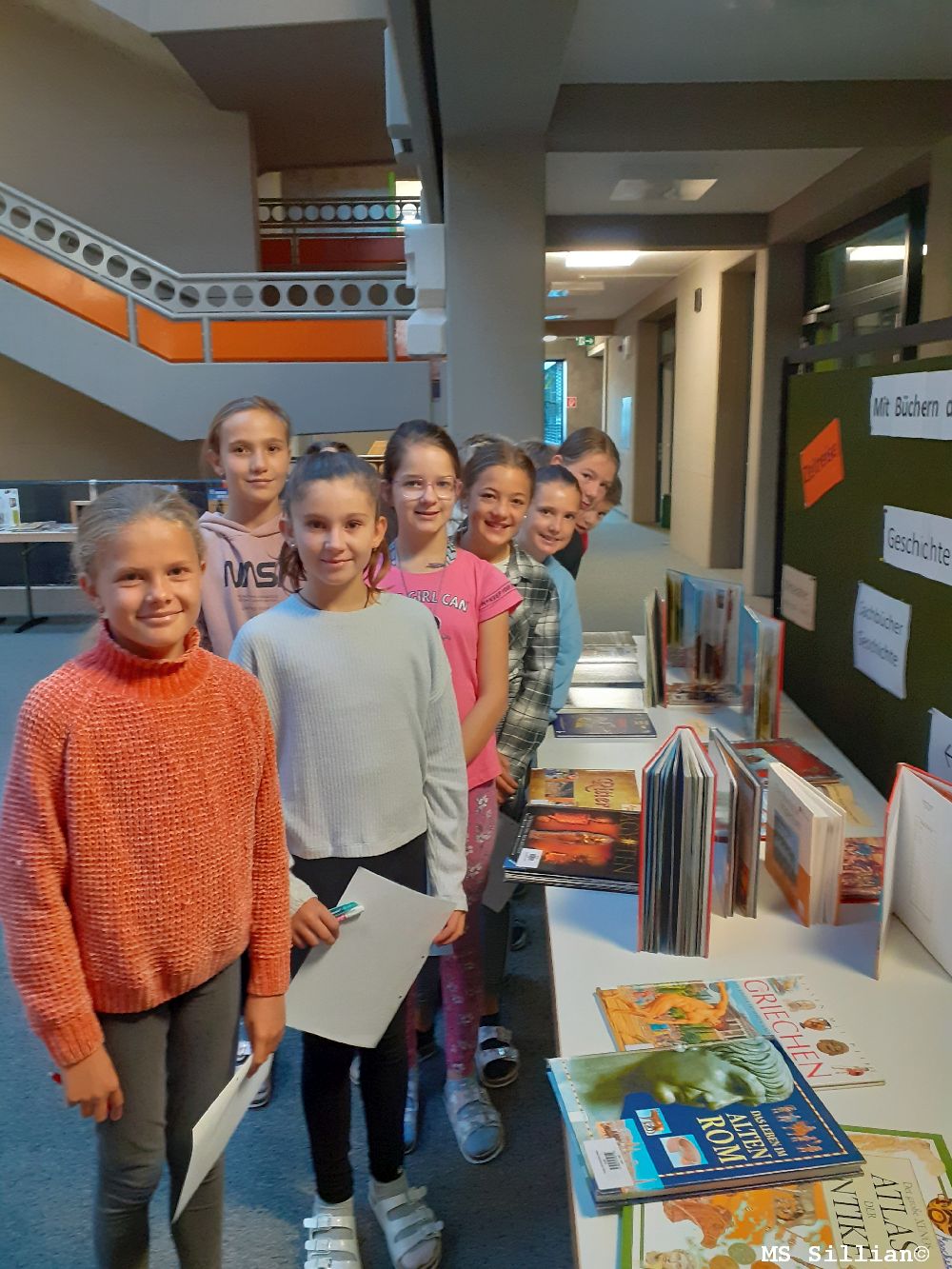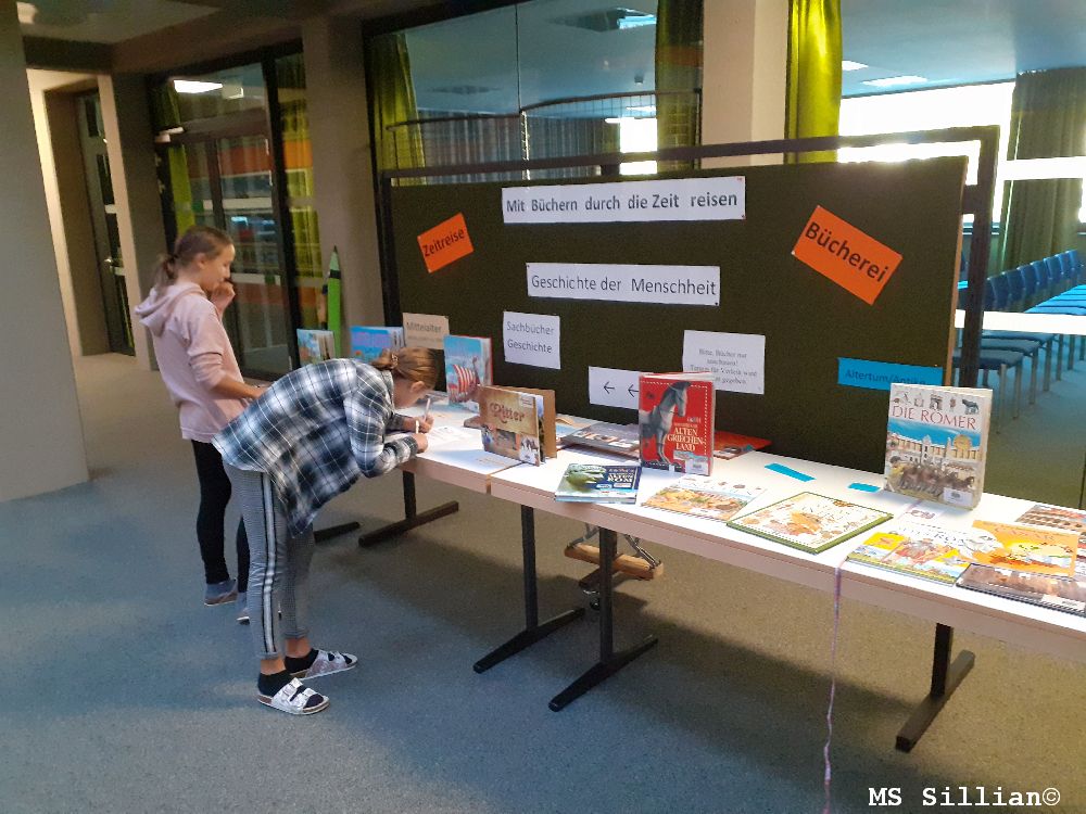 Gleich zu Beginn des Schuljahres empfingen die 2. Klassen in der Aula viele Sachbücher aus unserer Bücherei zu ihrem neuen Unterrichtsgegenstand GSK/PB. Aus beliebten Kinderbüchern, wie etwas die Serie „Das fliegende Baumhaus“ (auch in der Bücherei zu finden!) waren ihnen Zeitreisen durchaus geläufig. Durch die Anordnung der Bücher wurden den SchülerInnen verdeutlicht, welches Thema in welche der 6 GS-Epochen gehört: Wer dem Ötzi begegnen möchte, muss zurück in die Urgeschichte, die Pyramiden finden sich in den Frühen Hochkulturen, unser Nullpunkt und die Römer gehören in die Antike, auf einer Burg lebte man im Mittelalter, große Erfinder und Entdecker trifft man in der Neuzeit und wer sehen will, wie schlimm eine Atombombe wirkt, muss nach Hiroshima zum Ende des 2. Weltkrieges in der Zeitgeschichte. Außerdem gab es einen Stapel Fragen mit genau angegebenen Pfaden bis zur richtigen Antwort: Epoche, Buchtitel, Buchnummer, Inhaltsverzeichnis/Register. So war die Jagd nach richtigen Antworten kein Problem!
